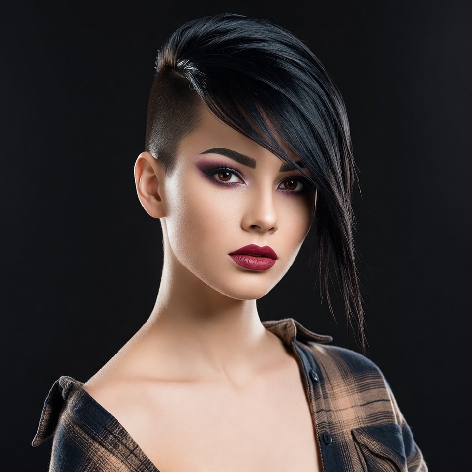 A young woman with a bold undercut black hairstyle stares directly at the camera against a black background. She has striking purple eyeshadow, dark red lipstick, and wears an open plaid shirt revealing her shoulders. Her hair is styled asymmetrically with one side shaved.