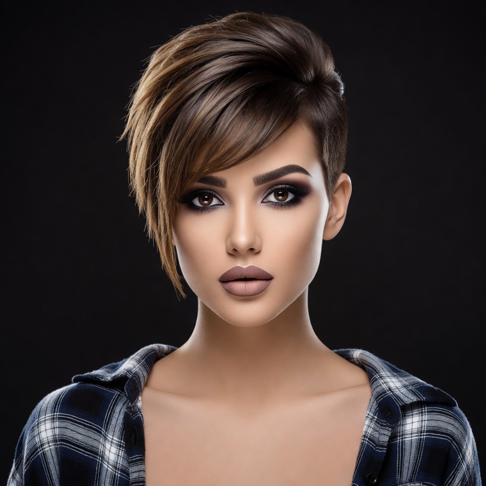 A young woman with a stylish short layered brown haircut featuring shaved sides poses against a black background. She has dramatic dark eye makeup, full lips with matte lipstick, and wears an open plaid shirt collar. Her expression is confident and direct gaze at the camera.
