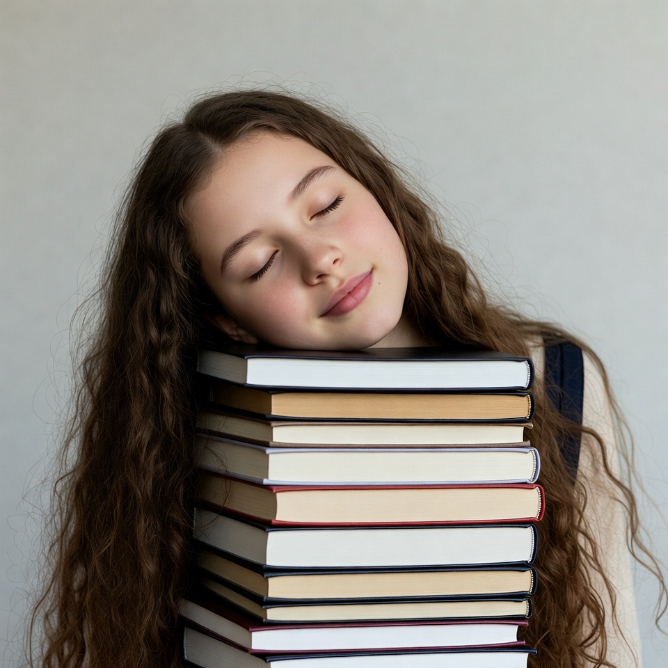 A young girl with long curly brown hair embraces a tall stack of colorful books against her cheek. Her eyes are closed, and she smiles gently while resting her head on the books. She wears a light-colored top on a plain white background.