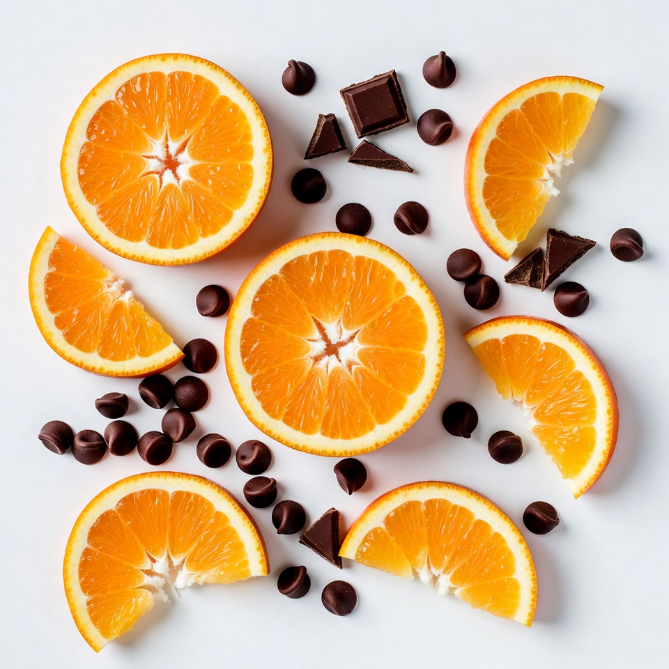 chocolate chips, chocolate pieces, citrus, dark chocolate, flat lay, food photography, fresh oranges, fruit, isolated background, juicy oranges, orange segments, orange slices, scattered chocolate, white background, oranges