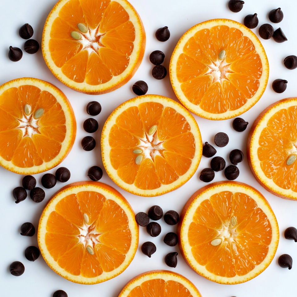 chocolate, chocolate chips, citrus, flat lay, food photography, fresh fruit, fruit, healthy snack, isolated, oranges, seeds, sliced oranges, top view, white background, orange slices