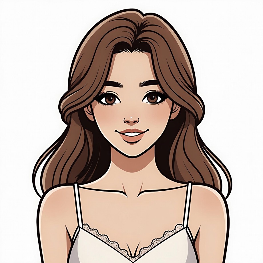Asian, brown hair, cartoon, cleavage, clipart, cute, female, illustration, isolated background, lace camisole, long hair, portrait, smiling, thin straps, wavy hair, white camisole, anime girl
