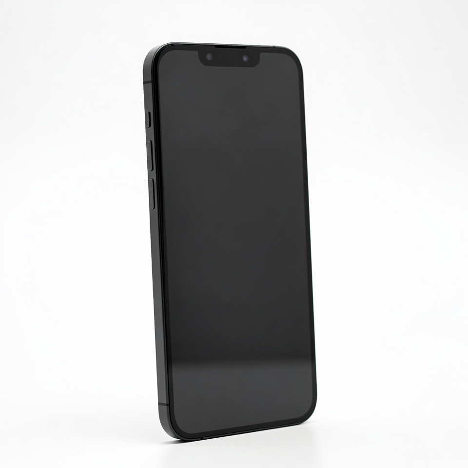 A black iPhone 14 Pro smartphone is shown from the side against a white background. The screen is off and displays a dark reflection. The device features a flat edge design with the Dynamic Island notch visible.