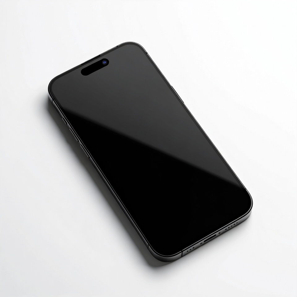 A sleek black iPhone 14 lies angled on a plain white background. The screen is completely black and reflective, with the notch visible at the top. The device shows its slim edges and camera module on the back.