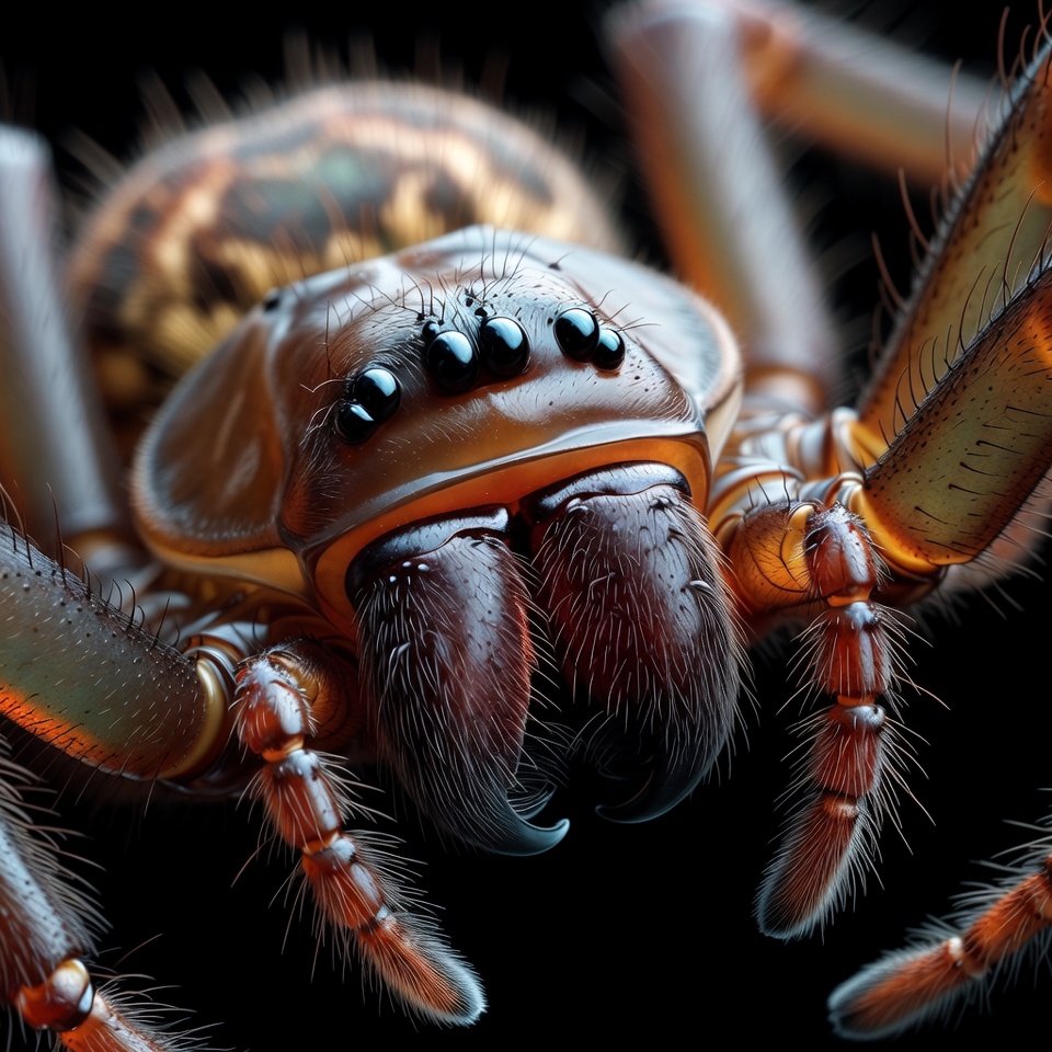 animal, arachnid, black eyes, close-up, dark background, detailed, fangs, hairy legs, illustration, insect-like, macro photography, orange spider, wildlife, wolf spider, spider