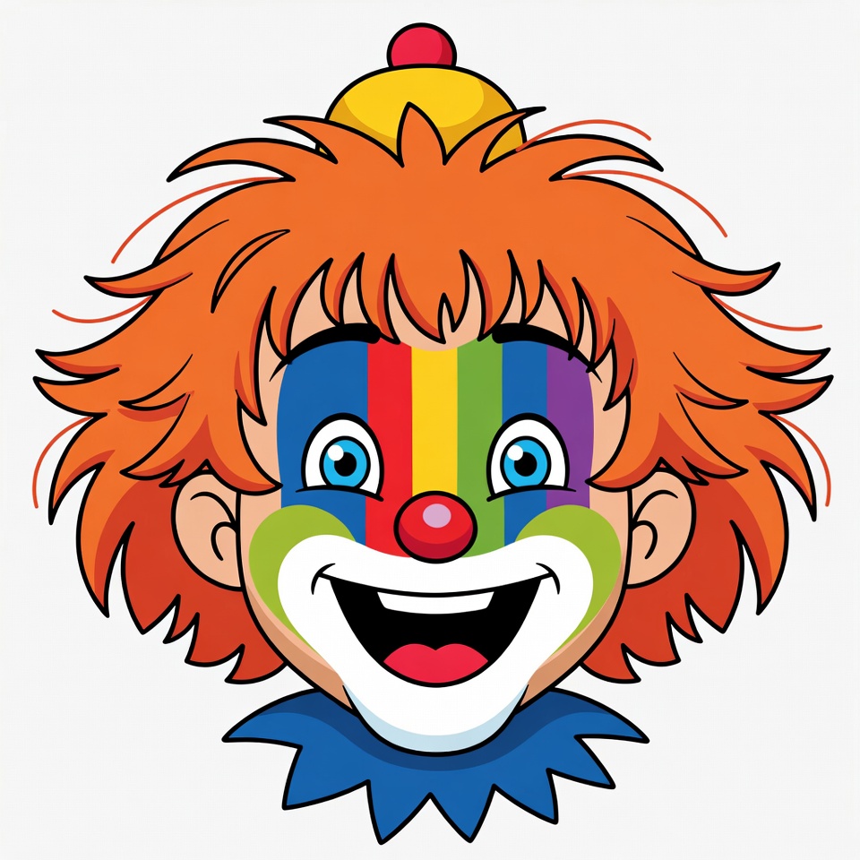 blue collar, blue eyes, cartoon clown, circus, clipart, clown face, colorful, curly hair, fun, illustration, isolated background, orange hair, rainbow makeup, red nose, red pom-pom, smiling clown, yellow hat, clown