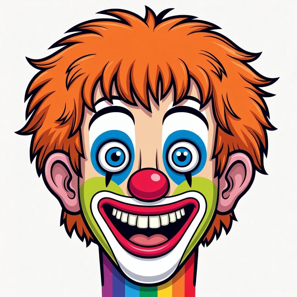 A vibrant cartoon illustration of a clown with wild orange hair, wide blue eyes, green face paint, white cheeks, red nose, and a huge smiling mouth. The clown has exaggerated features and a rainbow-colored neck extending downward. It is set against a white isolated background.