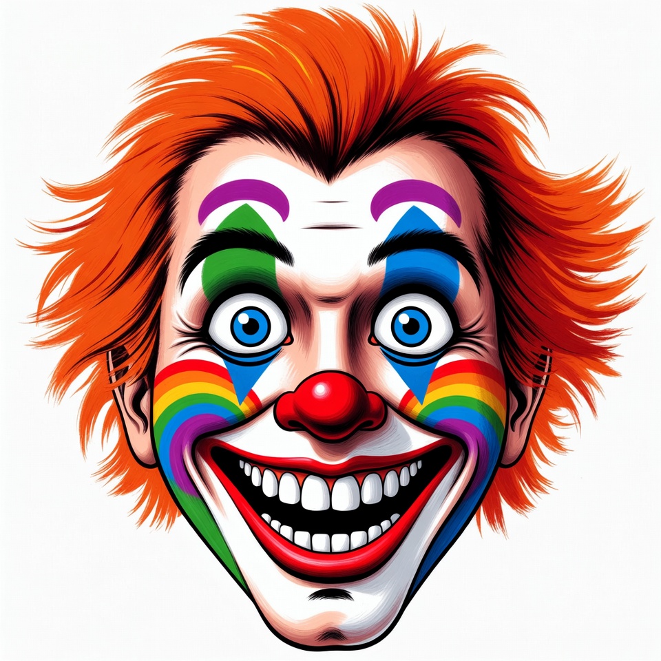 A cartoon clown face with wild orange hair and exaggerated features grins widely on a white background. The clown has bright blue eyes, a large red nose, and multicolored makeup including green eyelids, purple eyebrows, and rainbow cheeks. The illustration features sharp white teeth and vibrant, bold colors.