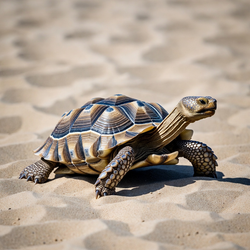 A radiated tortoise with intricate black and yellow geometric shell patterns walks on a sandy beach. Its head is extended forward with a focused expression, and its textured legs are visible against the light-colored sand. The background features blurred sandy terrain under natural daylight.
