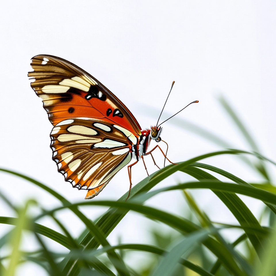 A vibrant orange butterfly with white and black markings perches on a green grass blade. Its wings are spread open, showcasing intricate patterns and long antennae. The butterfly is isolated against a white background with grass in the foreground.