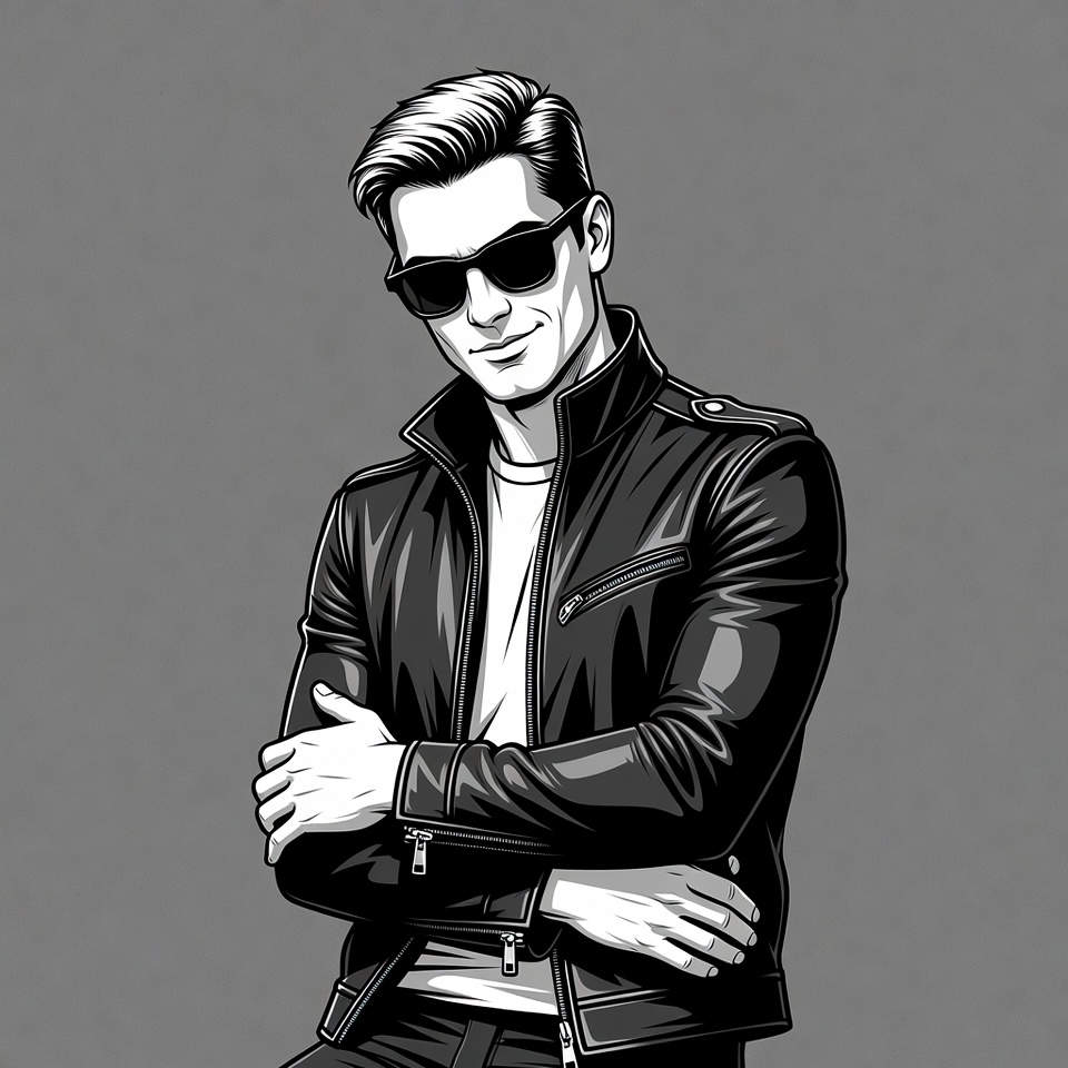 A young man with short slicked-back hair and sunglasses smiles confidently while standing with arms crossed. He wears a black leather jacket over a white t-shirt and dark pants. The illustration is rendered in black and white line art on a gray background.