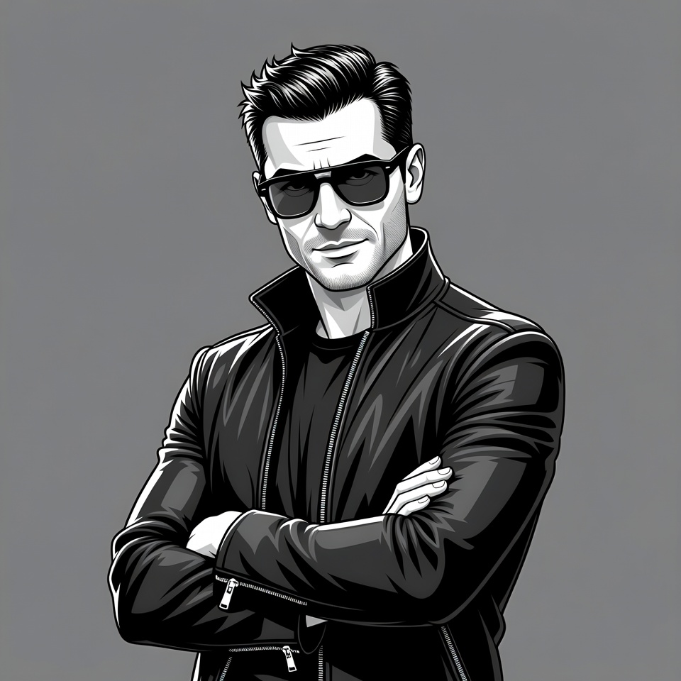 A black and white illustration depicts a man with short dark hair wearing sunglasses and a leather jacket over a t-shirt. He stands with arms crossed confidently against a gray background. The style is a detailed vector drawing with sharp lines and shading.