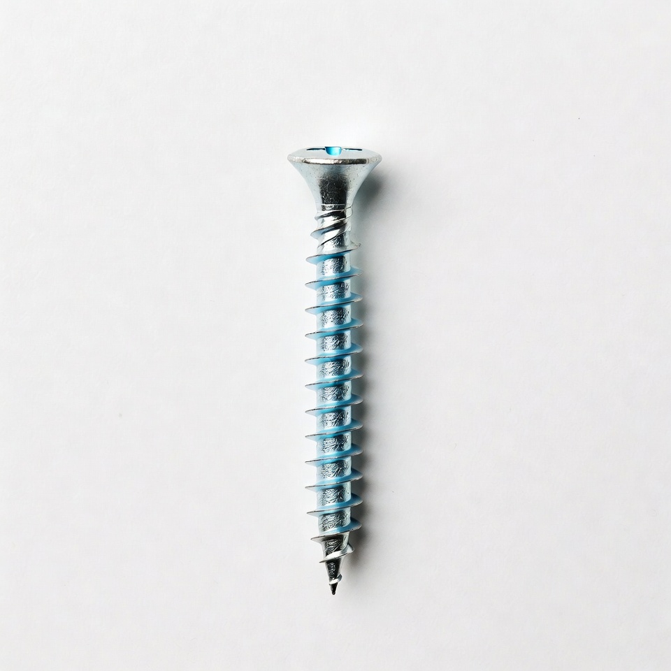 A close-up view of a silver metal wood screw with a Phillips head and blue-tinted threads lies vertically on a plain white background. The screw has a tapered point and coarse threading designed for wood. It is isolated against the white surface for clear visibility.