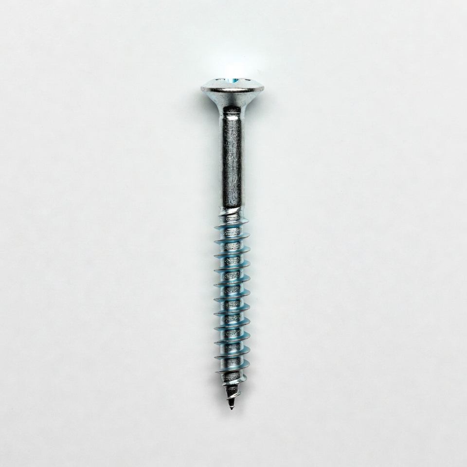 A silver Phillips head wood screw with coarse threads is positioned vertically on a plain white background. The screw has a flat top with a cross-shaped drive slot and a tapered point at the bottom.