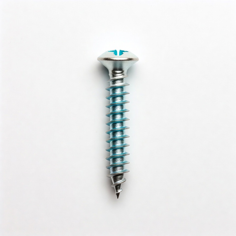 A silver Phillips head screw with a turquoise-tinted cross recess stands vertically on a plain white background. The screw features a smooth domed head and a threaded shaft ending in a sharp point. It is isolated for clear visibility.