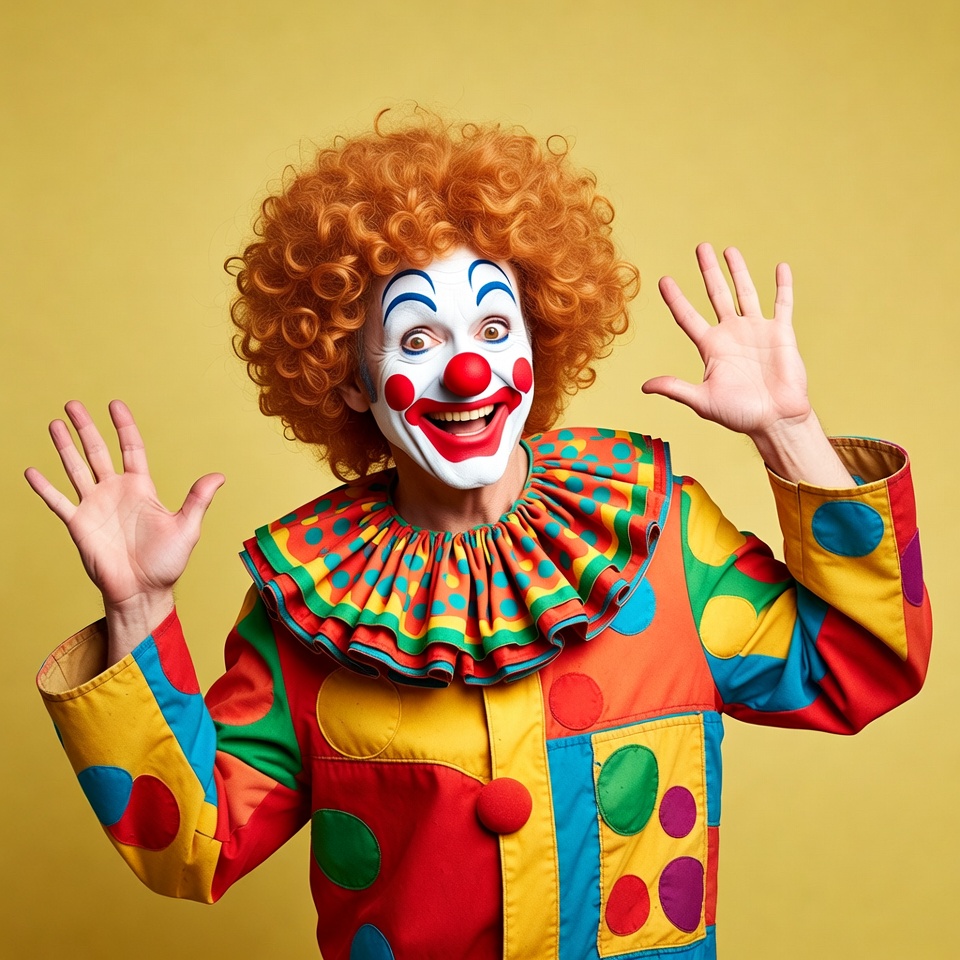 A clown with exaggerated white face paint, red smiling lips, and large blue eyes poses excitedly on a solid yellow background. The clown wears a vibrant multicolored polka-dot outfit with a ruffled collar and has bright red curly wig hair. Both hands are raised with fingers spread wide in a cheerful gesture.