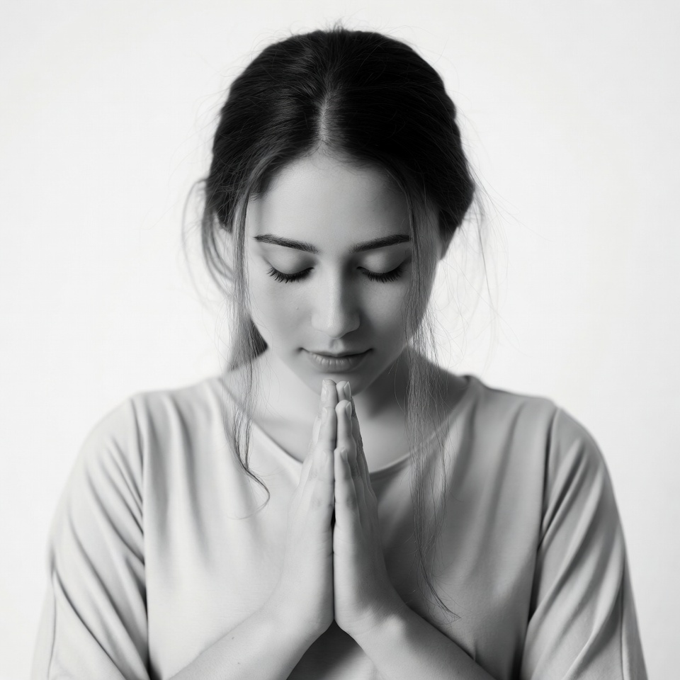 A young woman with long dark hair stands against a white background, her eyes closed in serenity. She wears a light-colored top and holds her hands together in a prayer gesture at chest level. Her expression is calm and focused.