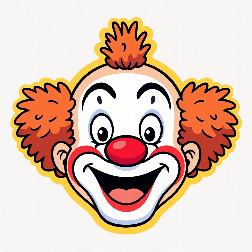 A vibrant cartoon illustration of a clown's face features a large white face with black eyebrows and outlines. The clown has spiky orange hair on both sides, rosy cheeks, a big red nose, and a wide smiling mouth showing teeth. The design is outlined in yellow on a white background.