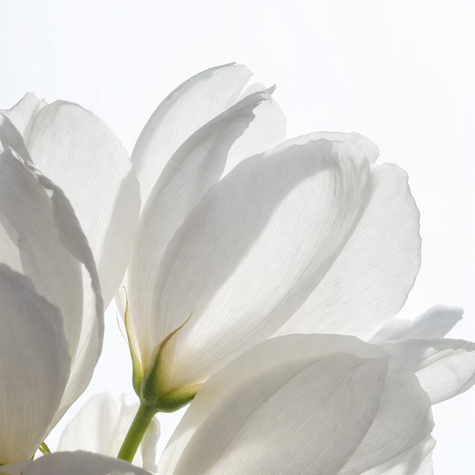 A cluster of white tulips with delicate petals is arranged against a plain white background. The flowers feature soft green stems and subtle backlighting that highlights their translucent petals. The composition focuses closely on the blooms in a tight grouping.