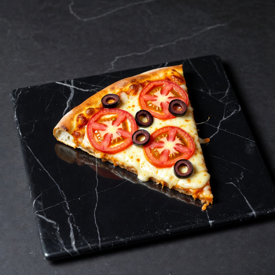 A slice of pizza topped with melted cheese, fresh red tomatoes, and black olives sits on a black marble surface. The crust is golden and slightly charred, with cheese stretching from the tip. The toppings are arranged neatly on the triangular slice.