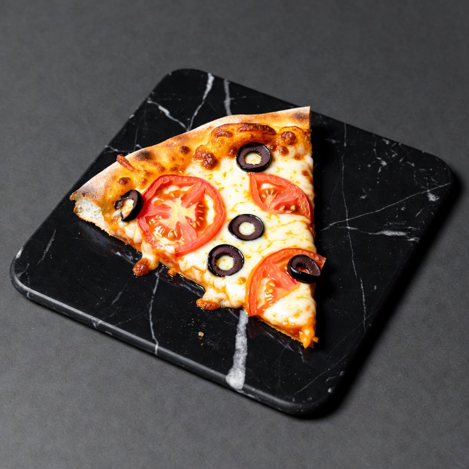 A slice of pizza topped with tomato slices and black olives sits on a black marble surface. The crust is golden and crispy with melted cheese. It's presented from a top-down angle on a square slab.