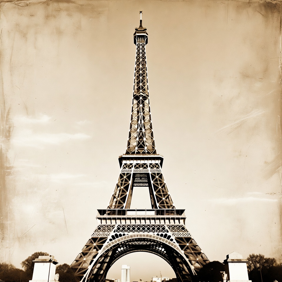 The Eiffel Tower stands tall against a sepia-toned sky with a vintage filter effect. Its intricate iron lattice structure is prominently featured from a low angle, emphasizing the height and arches at the base. Subtle clouds and distant trees frame the iconic landmark.