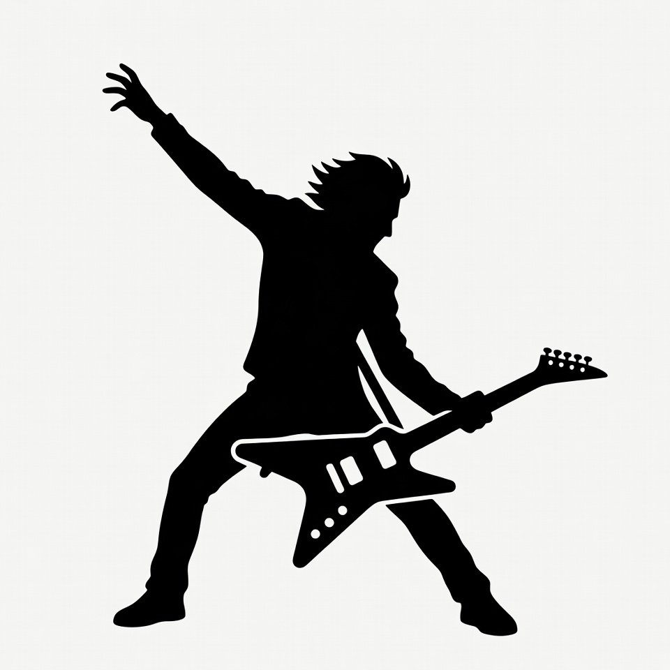 A black silhouette illustration depicts a male rock musician dynamically playing an electric guitar. He has long windswept hair, wears a jacket and pants, and strikes a wide-legged pose with one arm raised. The image is isolated on a white background.
