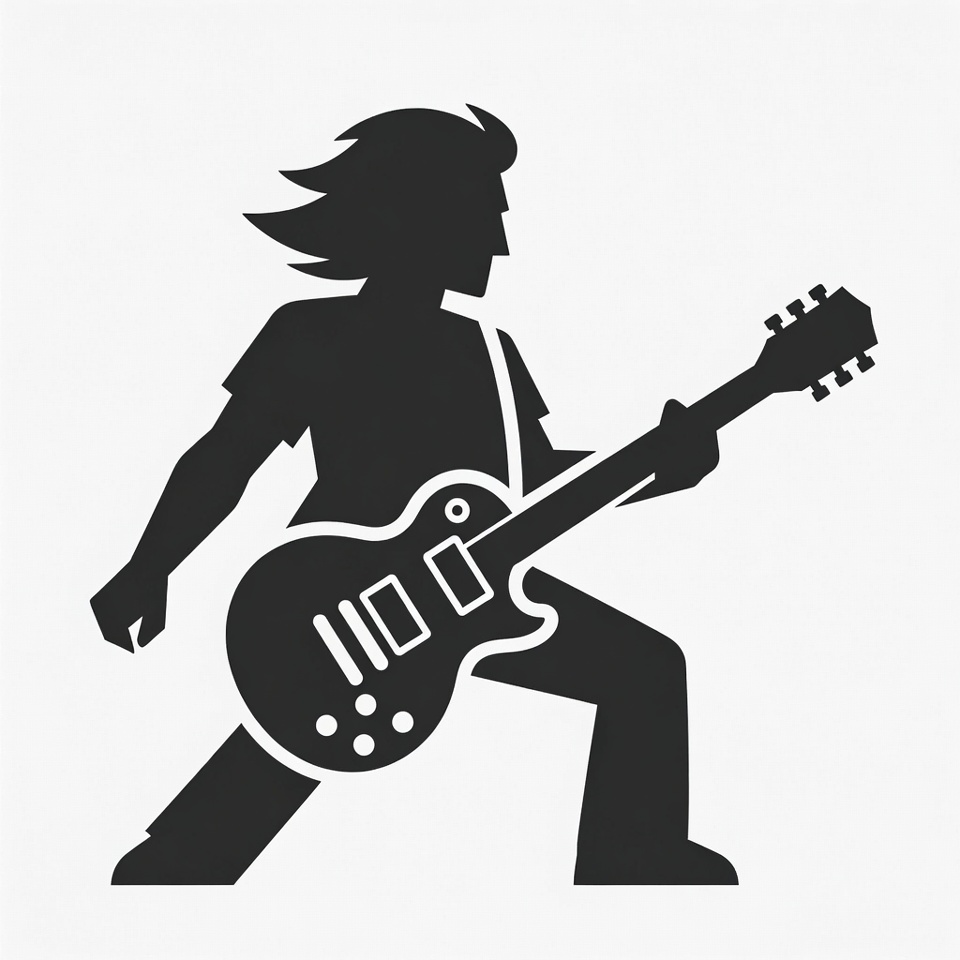 A black silhouette illustration depicts a man with long flowing hair dynamically playing an electric guitar. He wears a t-shirt and pants, with the guitar strap over his shoulder and one leg bent in a rocking pose. The figure stands against a plain white background.