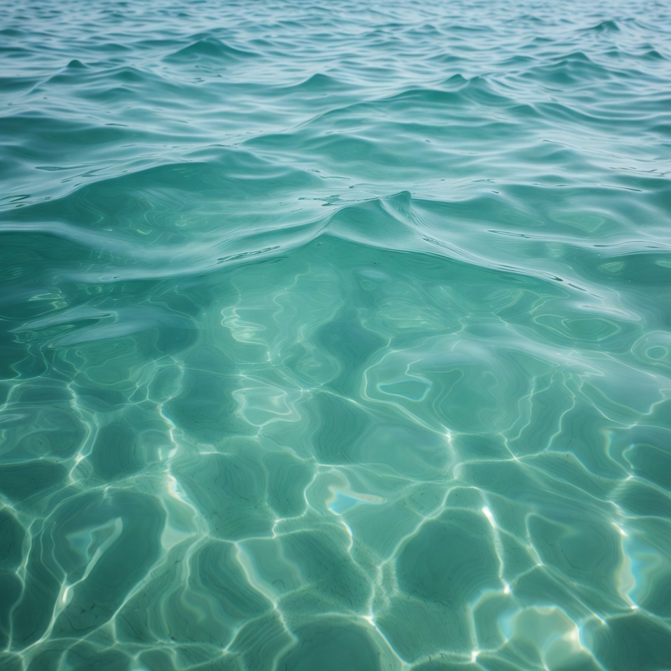 A close-up view of gentle waves in clear turquoise ocean water. Sunlight sparkles on the rippling surface, creating shimmering reflections. The water appears transparent with subtle depth visible beneath the waves.