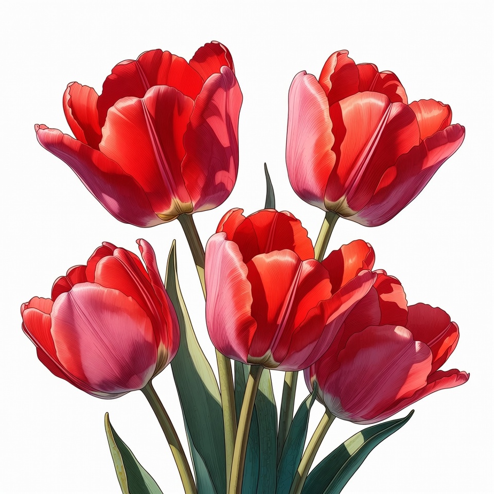 blooming tulips, bouquet, floral arrangement, flower cluster, flowers, green leaves, green stems, isolated background, petal texture, red flowers, spring flowers, tulips, vibrant red, white background, red tulips