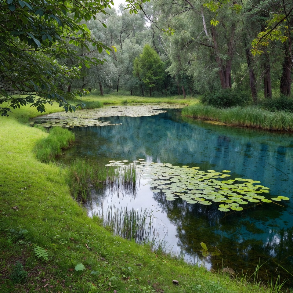 aquatic plants, blue pond, foliage, forest pond, grass, green trees, greenery, lily pads, lush greenery, marsh, natural pond, nature, reeds, reflections, river bend, riverbank, serene landscape, summer nature, swamp, trees, turquoise water, water lilies, water plants, wetland, white flowers, pond