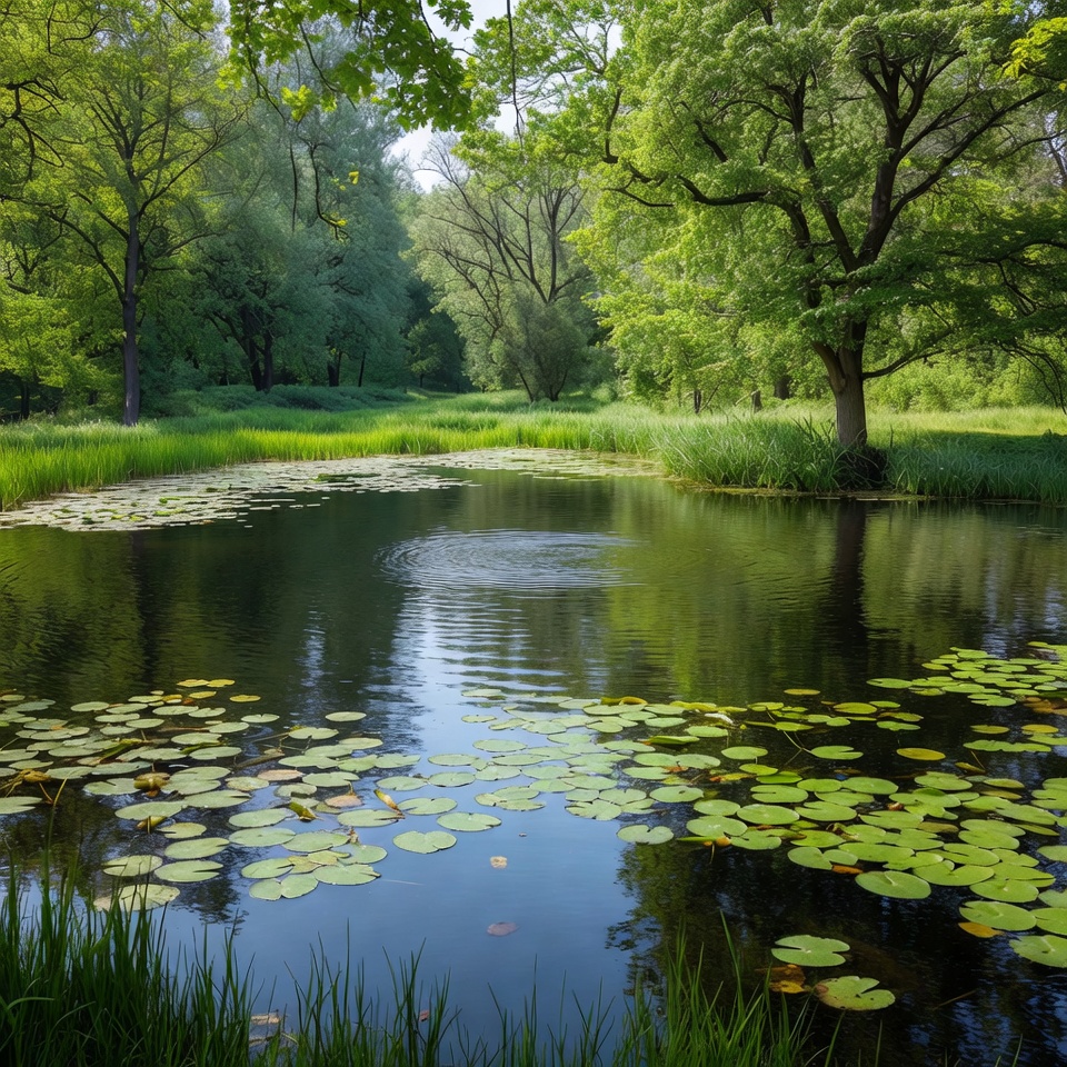 calm water, foliage, forest, forest pond, green lily pads, green trees, lily pad pond, lily pads, lush greenery, natural pond, nature, outdoor, peaceful pond, reeds, reflections, serene landscape, summer scene, sunlight, tranquil water, tree lined pond, water lilies, waterway, pond
