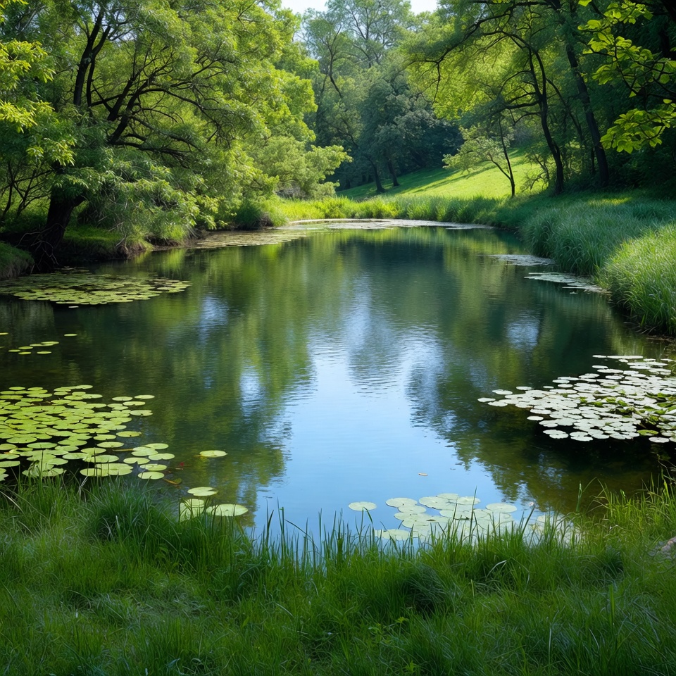 A calm pond surrounded by lush green trees reflects the vibrant foliage and blue sky. Clusters of white lily pads float on the glassy water surface. Lush green grass and reeds frame the edges of the serene waterway.