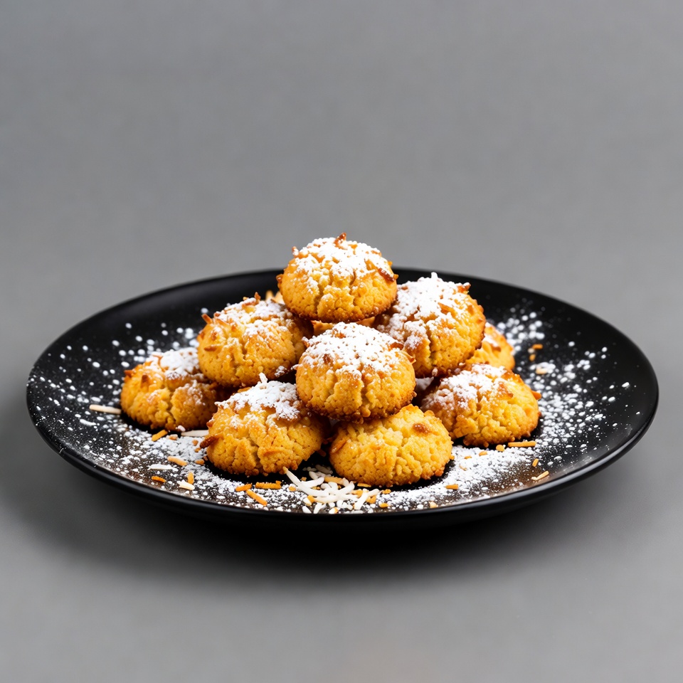 baked goods, black plate, closeup, cookies, dessert, food photography, golden cookies, gray background, homemade cookies, plate, powdered sugar, shredded coconut, stack, sugar dusting, sweet treats, coconut cookies