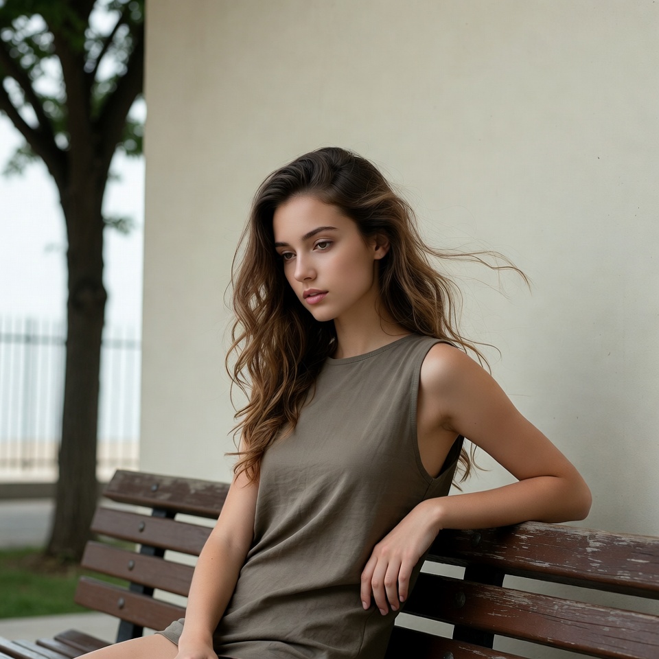 A young woman with long wavy brown hair sits on a wooden bench outdoors. She wears a sleeveless gray dress and gazes to the side with a subtle expression. A beige wall, green trees, and grass are visible in the background.