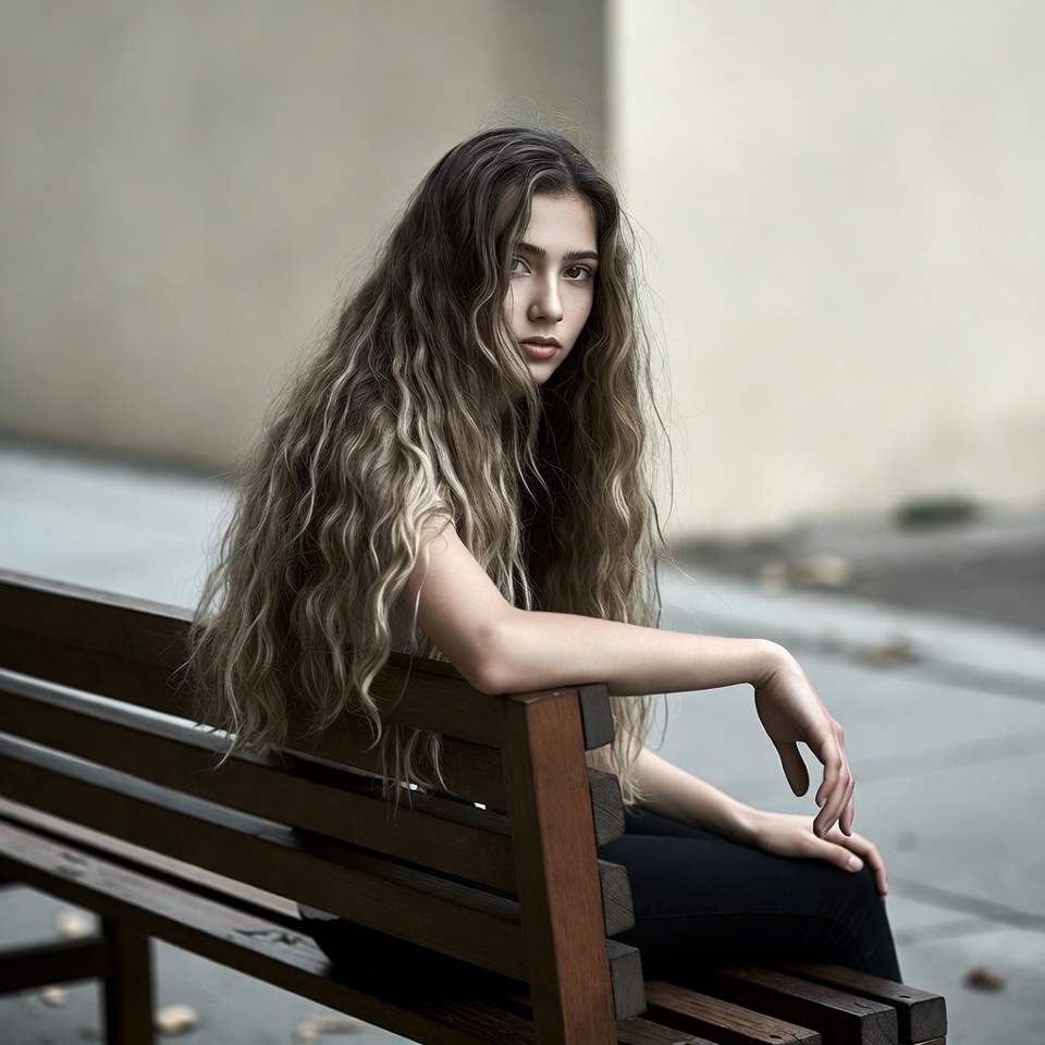 A young woman with long wavy brown hair sits on a wooden park bench against a beige wall. She wears a light top and black pants, with her arms resting on her lap and a thoughtful gaze to the side. The urban outdoor setting features a concrete sidewalk and blurred background.