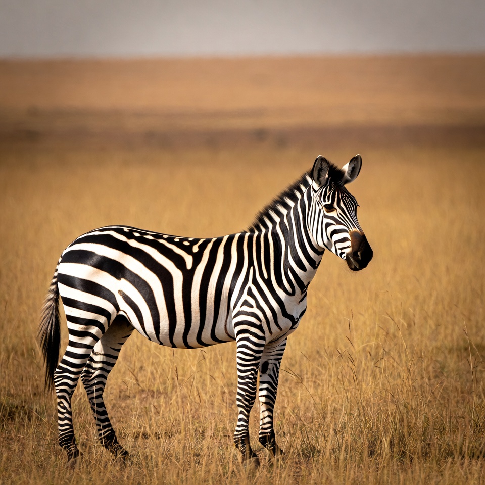 A zebra with black and white stripes stands in a dry golden grassland. It faces slightly to the side with its head turned, ears perked up. The background features a hazy savanna horizon.