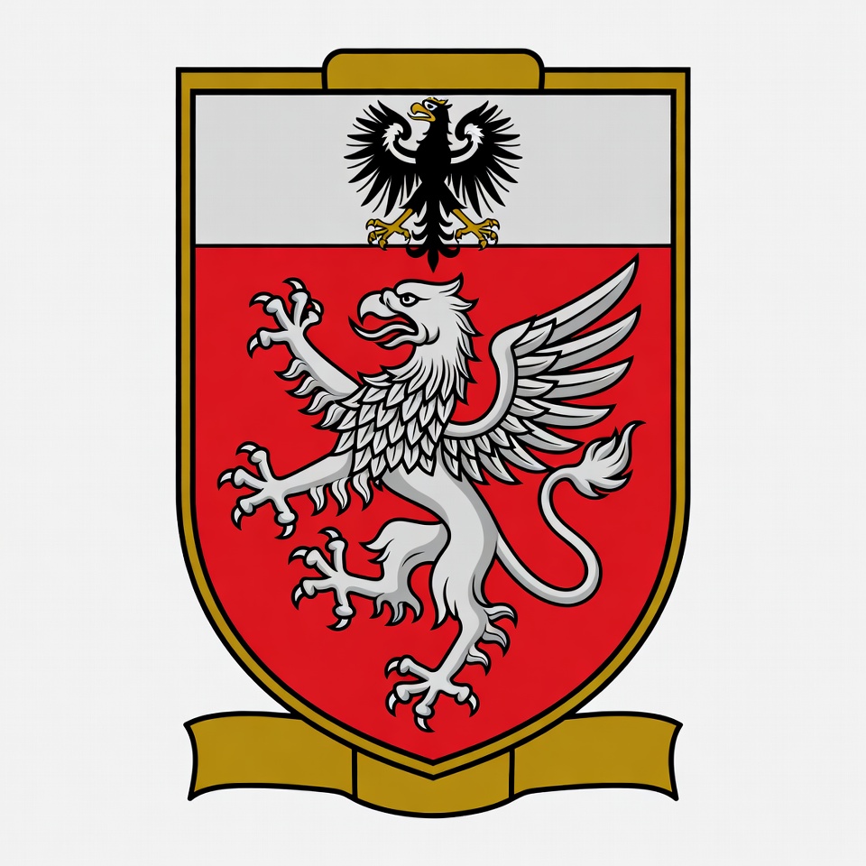A red heraldic shield features a large white griffin with outstretched wings and lion's body in the lower section. Above it, a black eagle with gold beak and talons stands on a white background within the shield. The shield has a gold border and a yellow ribbon at the bottom.