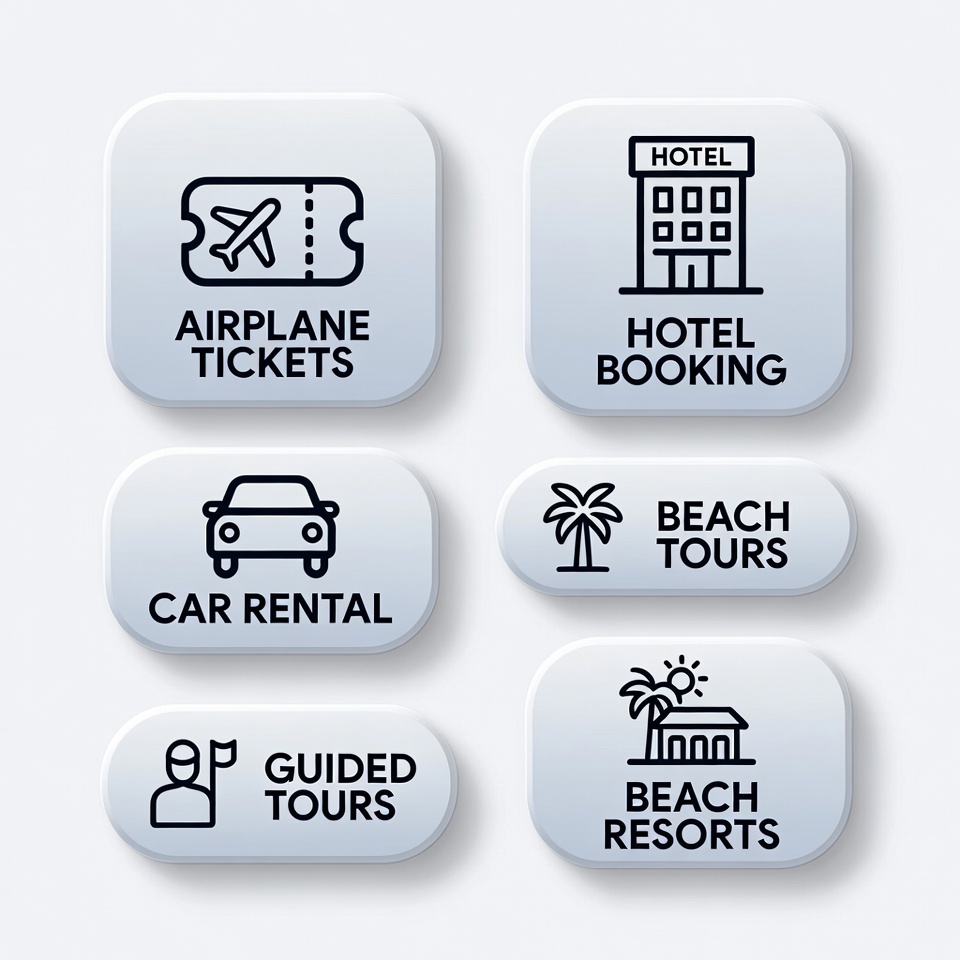 Six white square icons with black line art depict travel services on a light blue background. They include airplane tickets, hotel booking, car rental, guided tours with a tour guide figure, beach tours with palm tree, and beach resorts with sun and buildings. Each icon has a label below it naming the service.