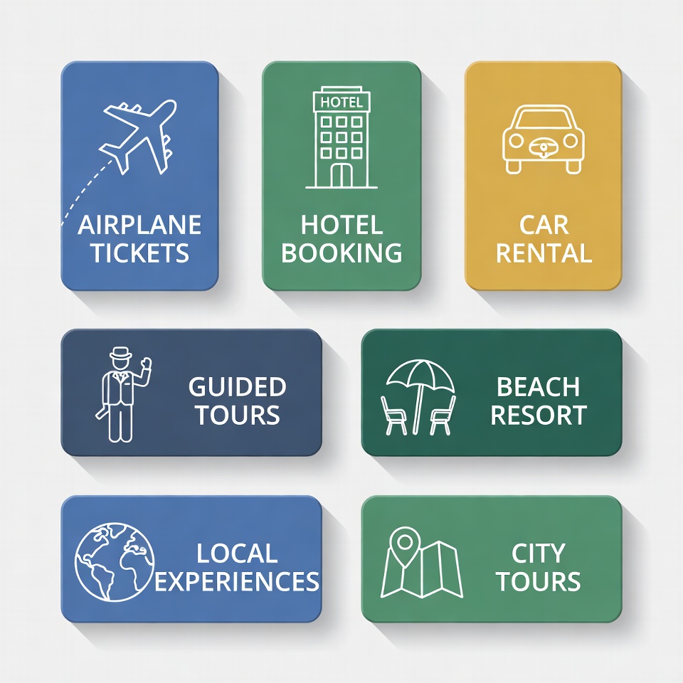 A set of six colorful rectangular icons depicting various travel services on a white background. The icons include an airplane with tickets, a hotel building, a car, a man in a suit for guided tours, beach chairs and umbrella, and a map for city tours. Each icon features simple line art illustrations with service labels.