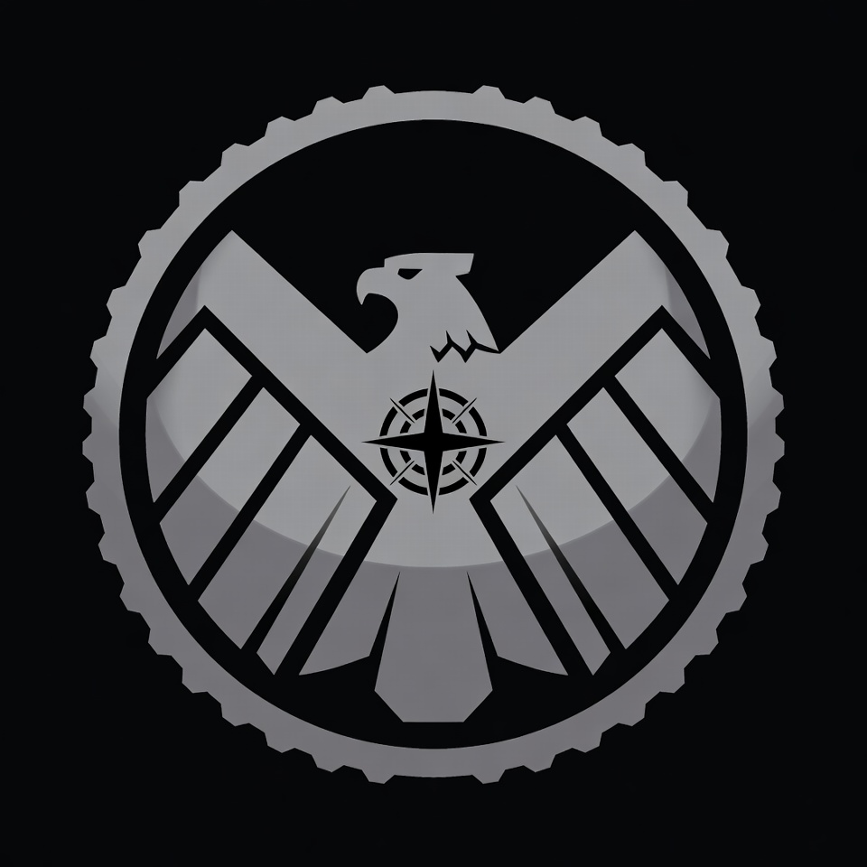 A metallic gray eagle emblem with outstretched wings forms the central design of the S.H.I.E.L.D. logo. A compass rose is positioned at the eagle's chest, all encircled by a thick gear-like ring on a black background. The illustration features sharp, angular lines in grayscale tones.
