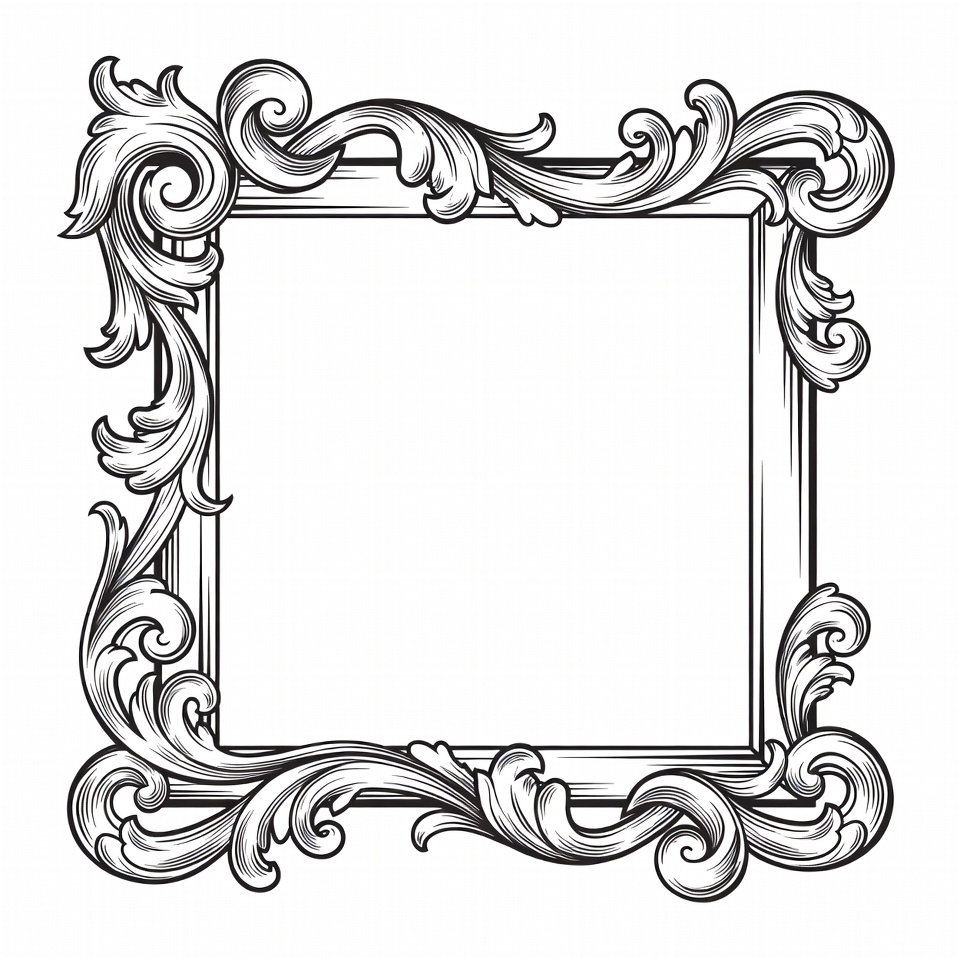 An intricate black line art frame features elaborate swirling floral and vine motifs. The elegant border surrounds a large empty square space. It is rendered in a classic baroque style on a white background.