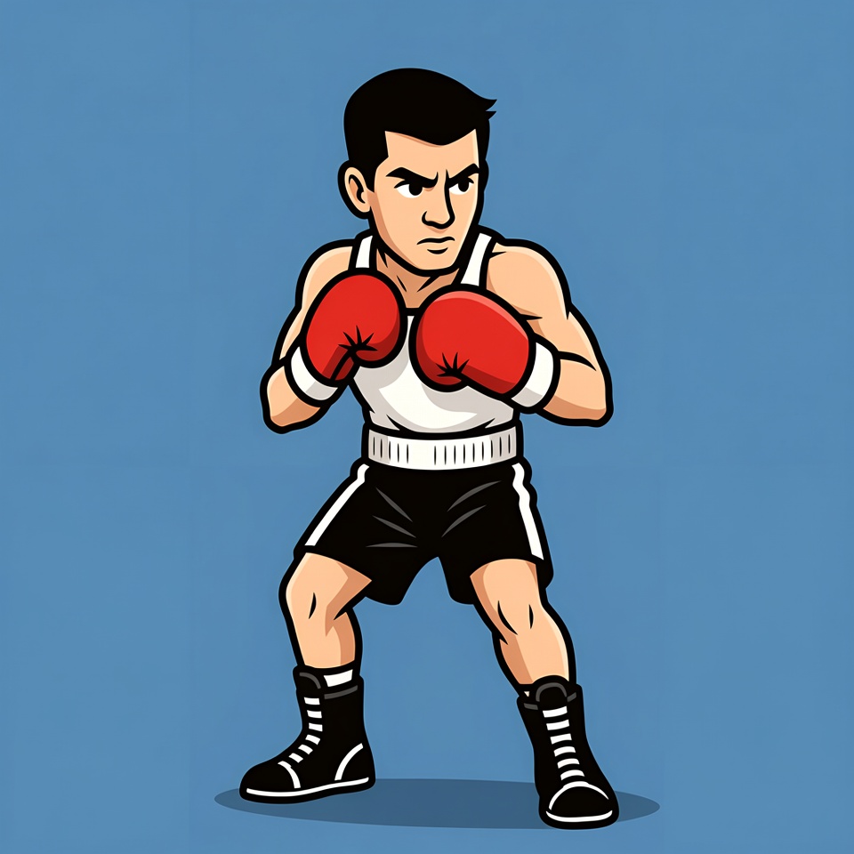 A muscular cartoon man with short black hair stands in a boxing stance on a blue background. He wears a white tank top, black shorts, red boxing gloves, and black sneakers. His expression is intense and determined.