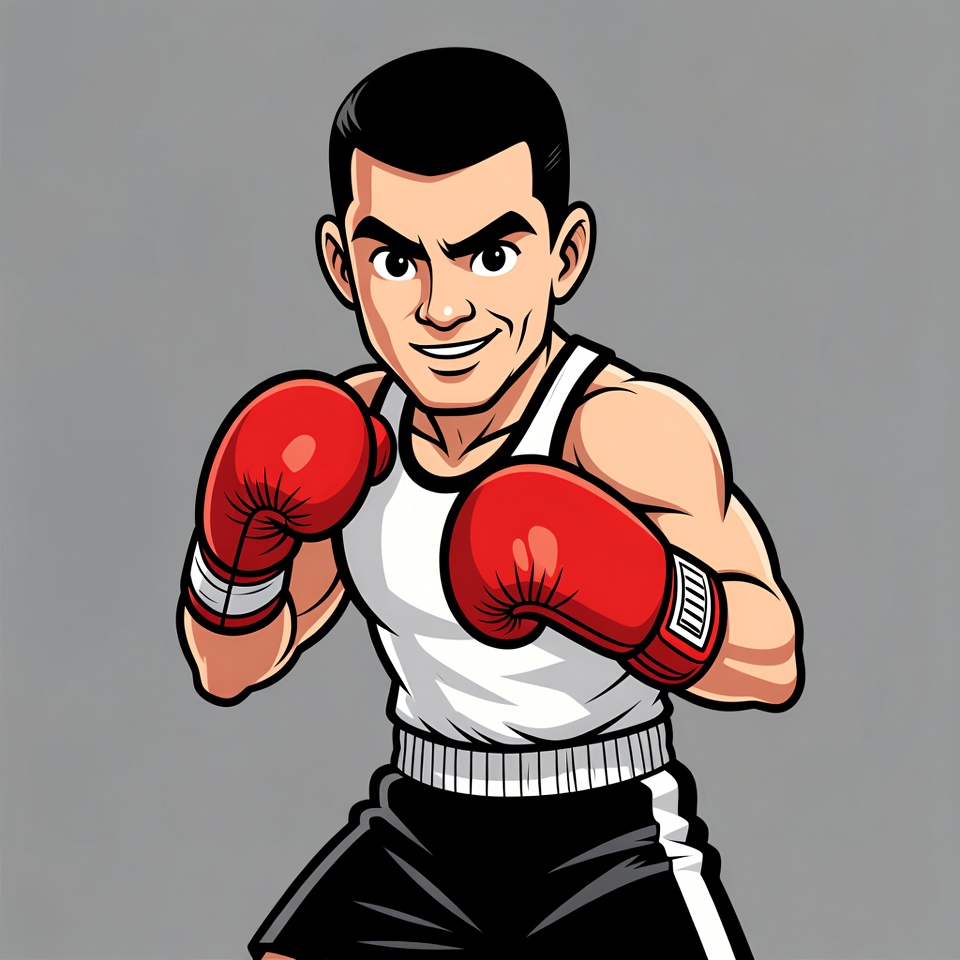 A muscular man with short black hair stands in a boxing pose on a gray background. He wears a white tank top, black shorts with white stripes, and red boxing gloves. The illustration features bold lines and a smiling expression.