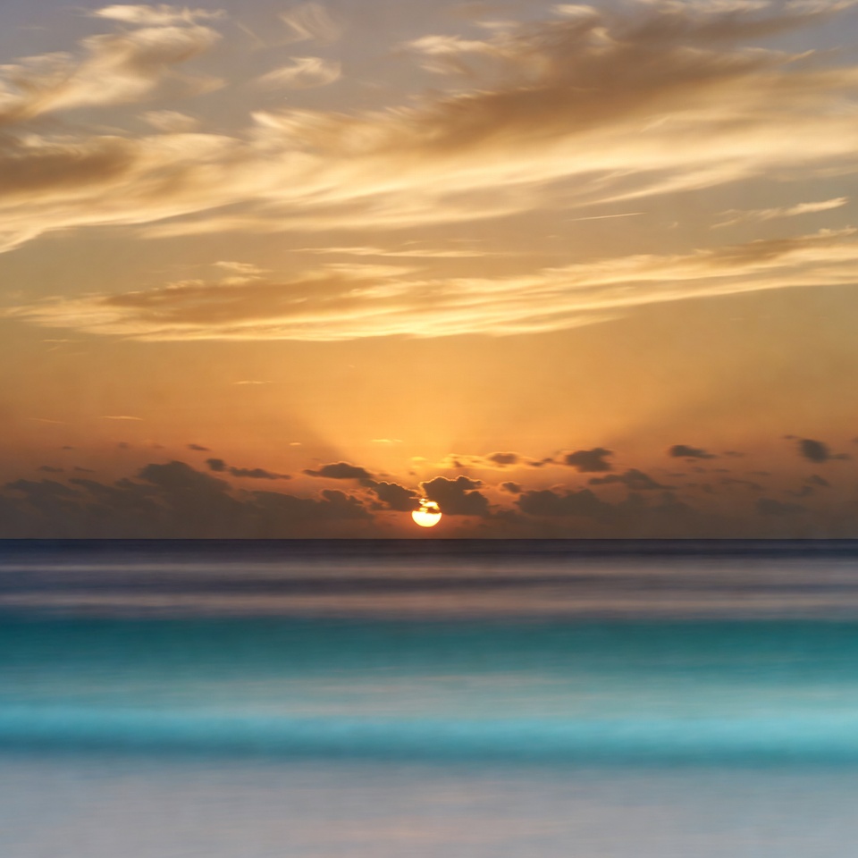 beach, blue water, calm sea, clouds, dusk, golden hour, horizon, landscape, nature, ocean, orange sky, rays, sea, seascape, serene, sky, sun, sunlight, tropical, turquoise water, waves, sunset