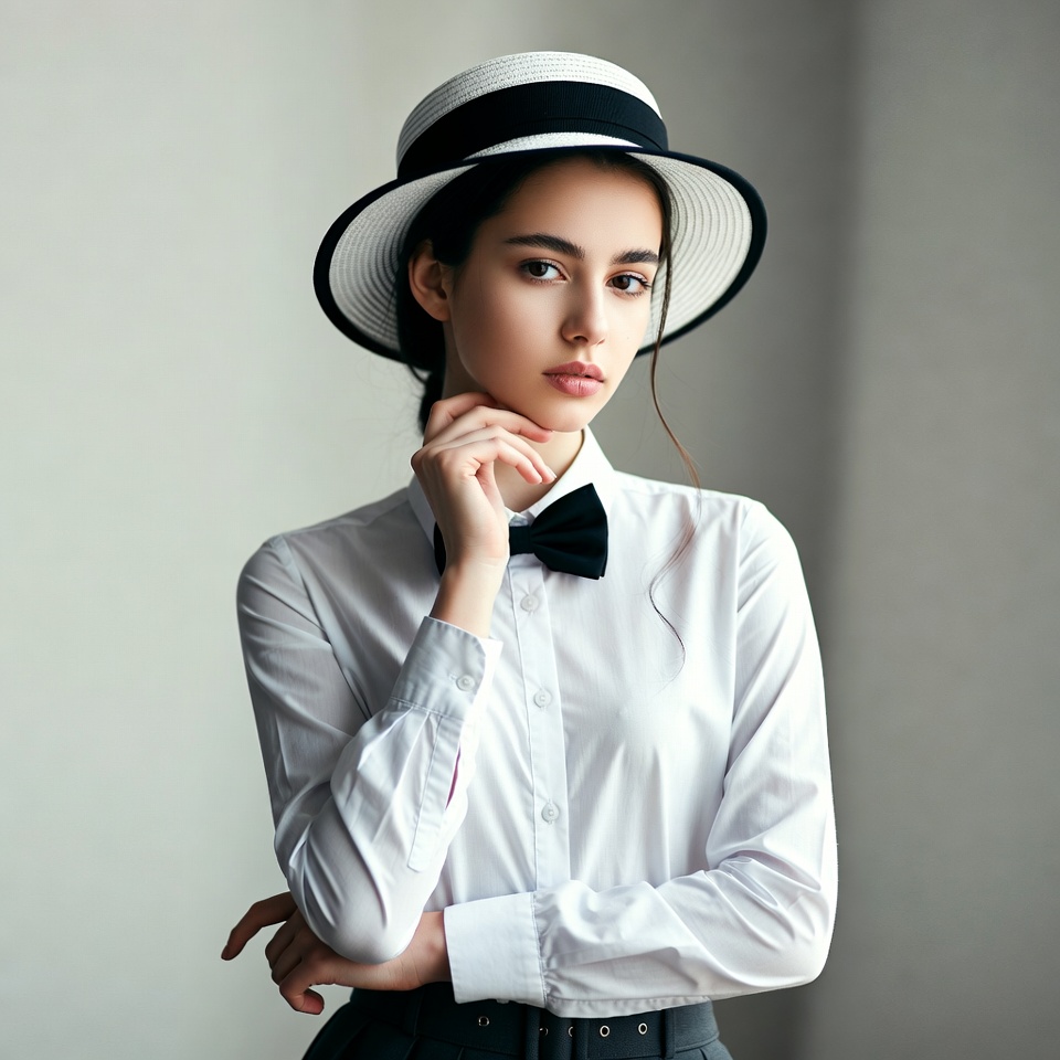 A young woman with dark hair stands against a plain white background, wearing a black and white straw hat tilted on her head. She has a thoughtful expression with her hand on her chin and wears a white dress shirt with a black bow tie and a dark skirt. Her arms are crossed, emphasizing her poised stance.