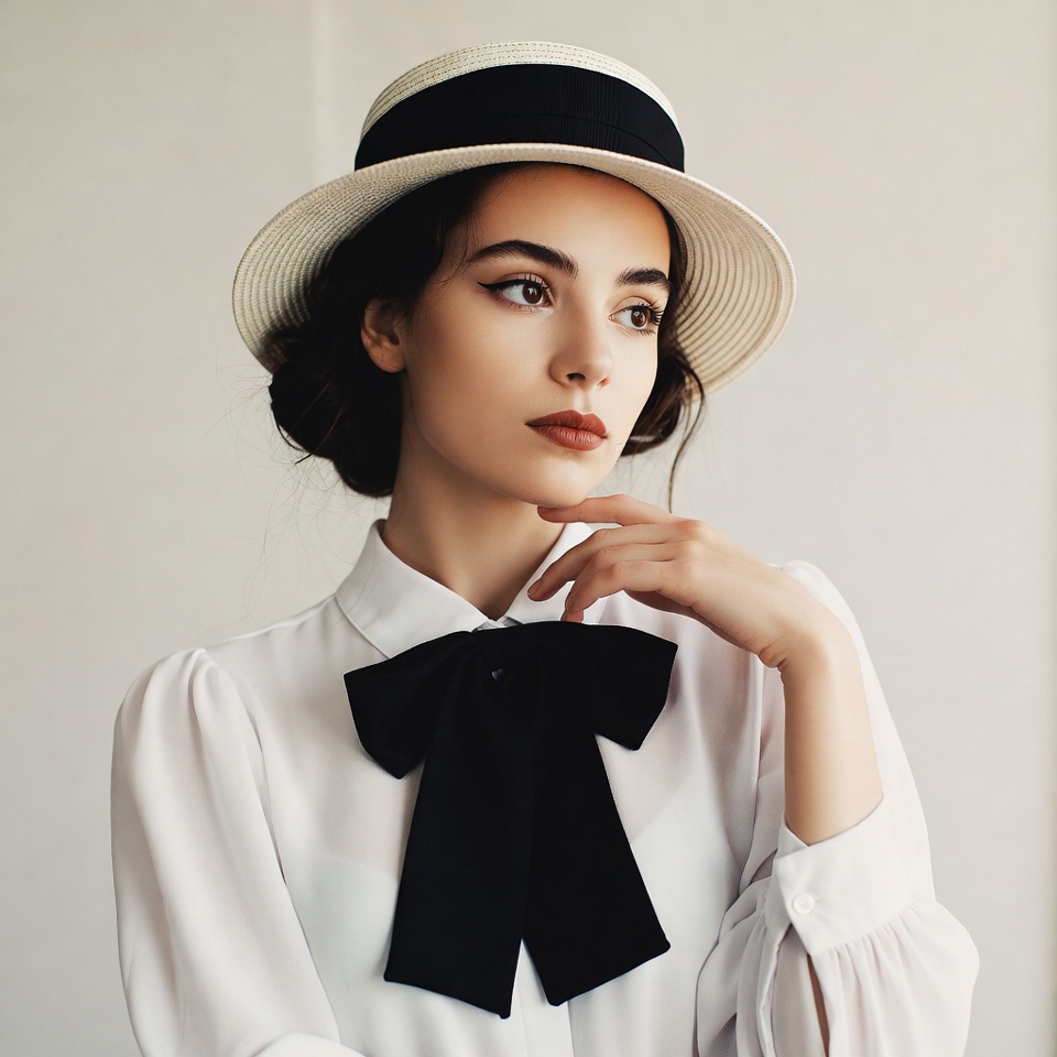 A young woman with dark hair styled in an updo wears a wide-brimmed straw hat with a black band. She has a thoughtful expression with her hand on her chin and dons a white blouse featuring a large black bow tie. She stands against a plain white background.