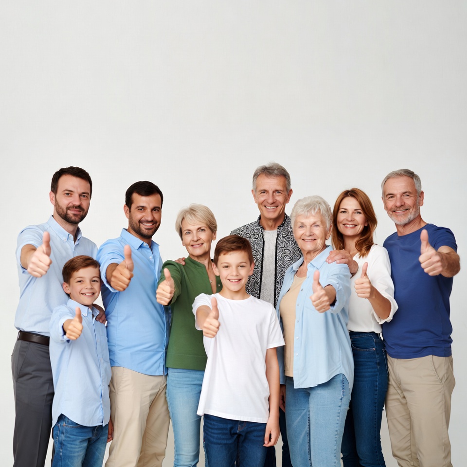 A large multigenerational family stands together against a white background, all making thumbs up gestures. The group includes elderly men and women, middle-aged men and women, and young boys, dressed in casual clothing like button-up shirts, sweaters, jeans, and t-shirts. They smile happily while posing closely as a family unit.
