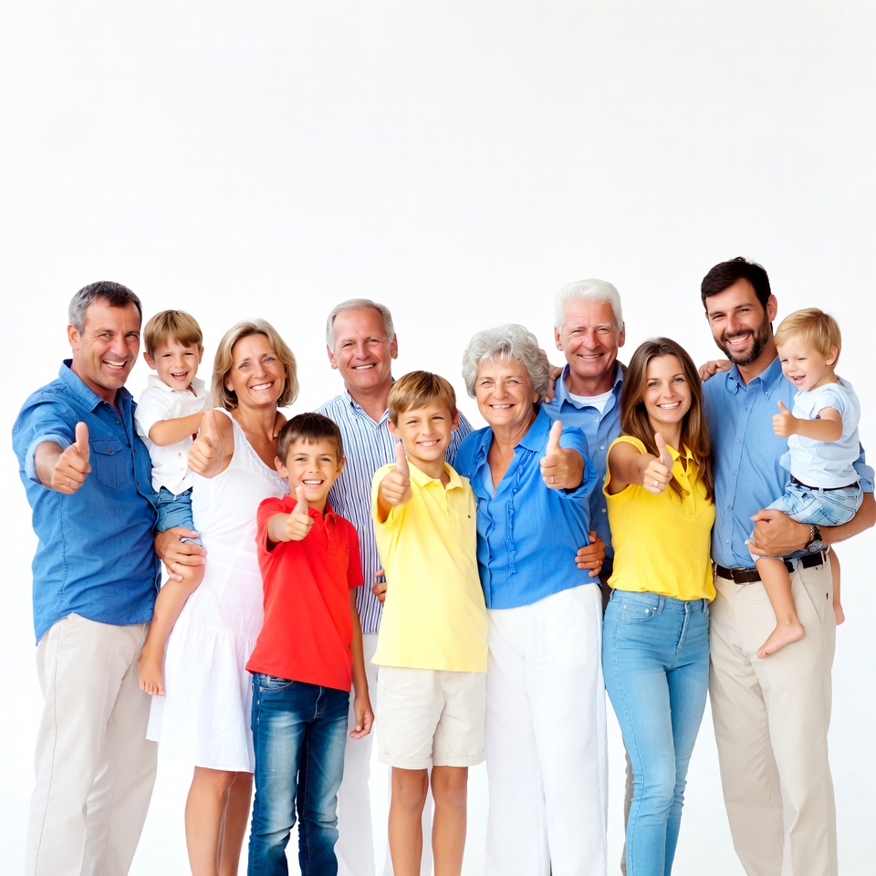 A large multi-generational family stands together on a white background, all making thumbs up gestures. The group includes smiling grandparents, parents, and children dressed in colorful casual clothes like t-shirts, jeans, and shorts. They pose closely with arms around each other, expressing positivity.