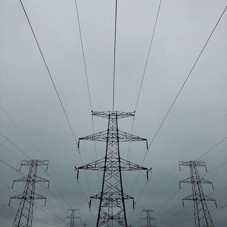 cloudy sky, electrical grid, electricity lines, energy, gray sky, high voltage, industrial, infrastructure, low angle, overcast, overhead lines, power grid, power lines, power tower, pylons, steel tower, transmission tower, utility pole, wires, electricity pylon
